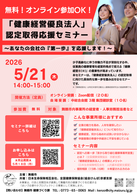 イベント情報月間行事予定舞鶴引揚記念館 令和7年度 第4回企画展「令和7年度 収蔵品展」令和7年度第4回市民講座「日本の近代化とれんが⑦監獄とれんが」を開催「市民主体による歴史的建築物の保存活用―楽しみながら守り育てる高知流のまちづくり―」講演会を開催します!【2026.5.21】『健康経営優良法人』認定取得応援セミナーを開催します!3月のカレンダー前月翌月