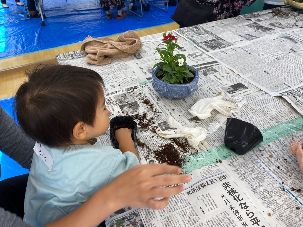 「植えるArt」は、乳幼児がアートにふれる機会を提供する事業「アートスタート」の一環として開催しているイベントです。舞鶴で活躍する陶芸家の高井晴美先生に教わって植木鉢をつくり、舞鶴で育てられた花苗を地元舞鶴の農家さんに教わりながら植える体験型プログラムです。
