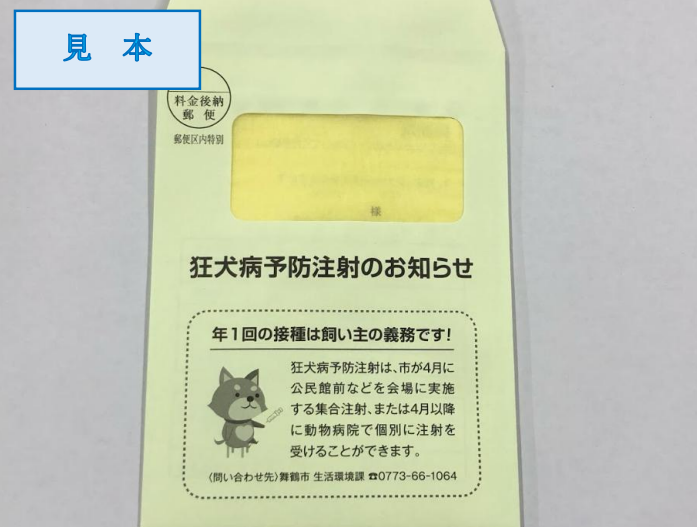 毎年3月末に、舞鶴市で登録のある所有者宛てに予防注射の案内を送付しています。
