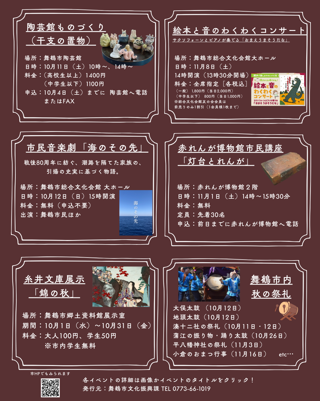 文化振興課より舞鶴の「文化の秋」を楽しむ催し情報をお届けします。