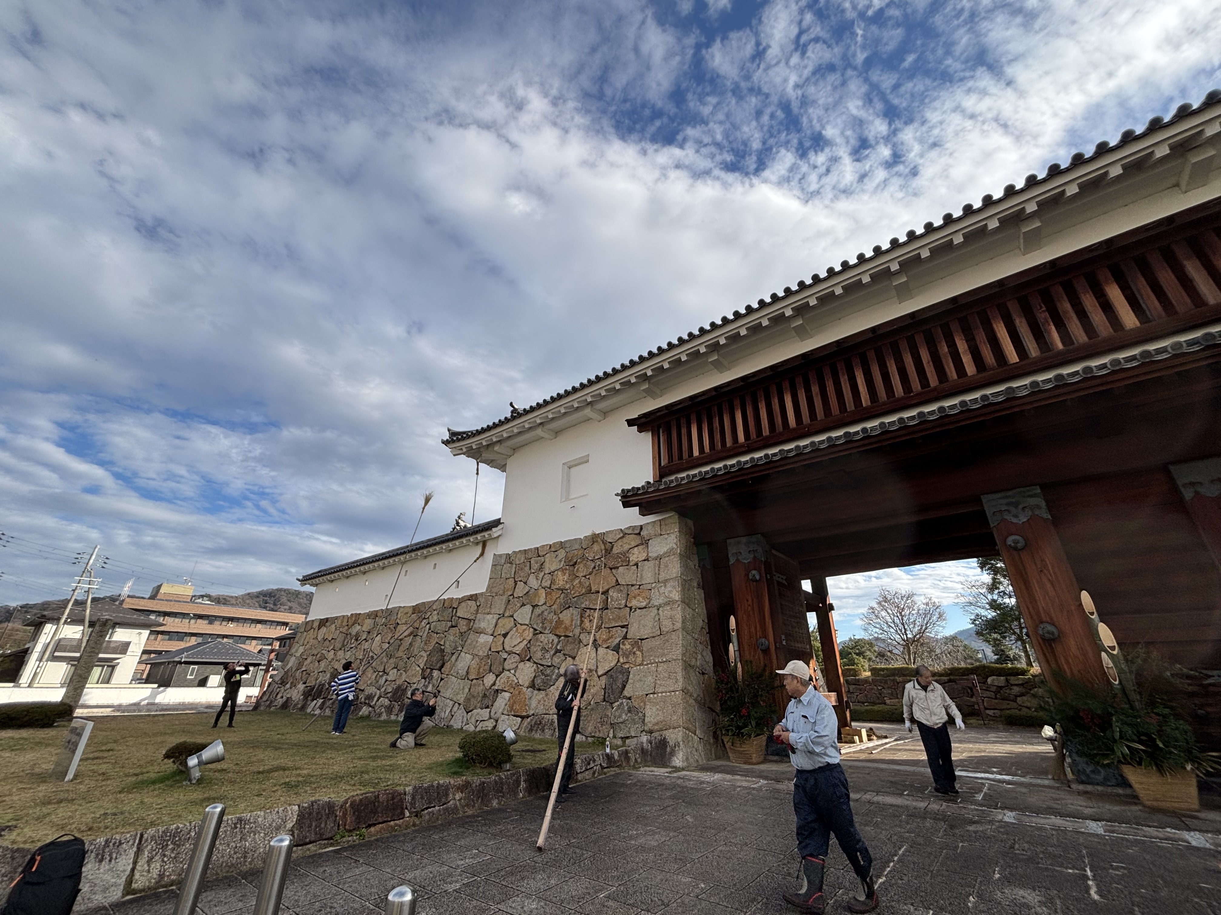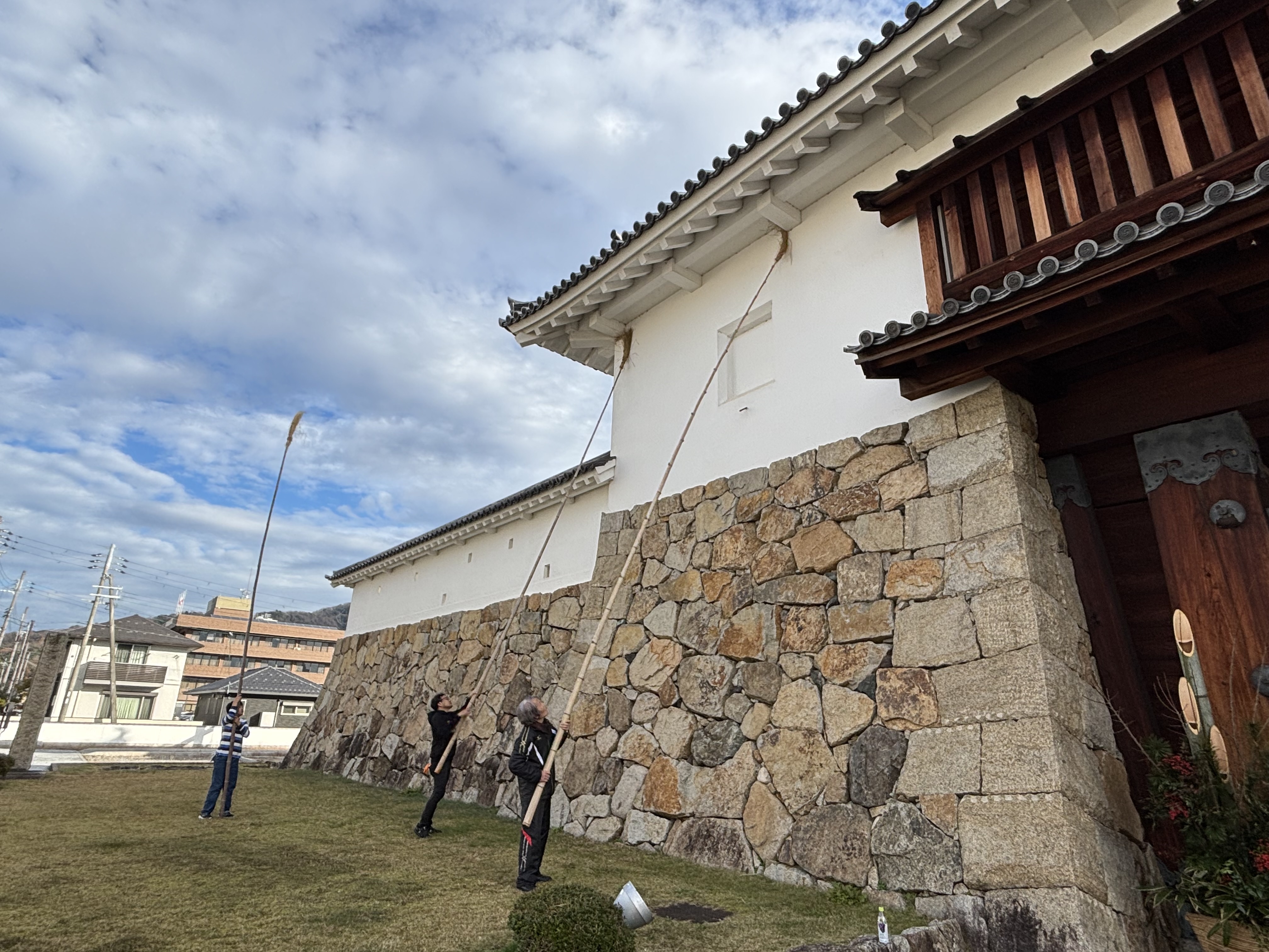 田邊家中之会が、1年間の感謝を込めてすすやほこりを払い、田辺城の城門を清掃しました。すす払いは平成23年から実施しており、今年で15回目となります。長さ約8メートルの竹竿を使って丁寧に清掃を行ったほか、手作りの門松も飾り、新年を迎える準備を整えました。