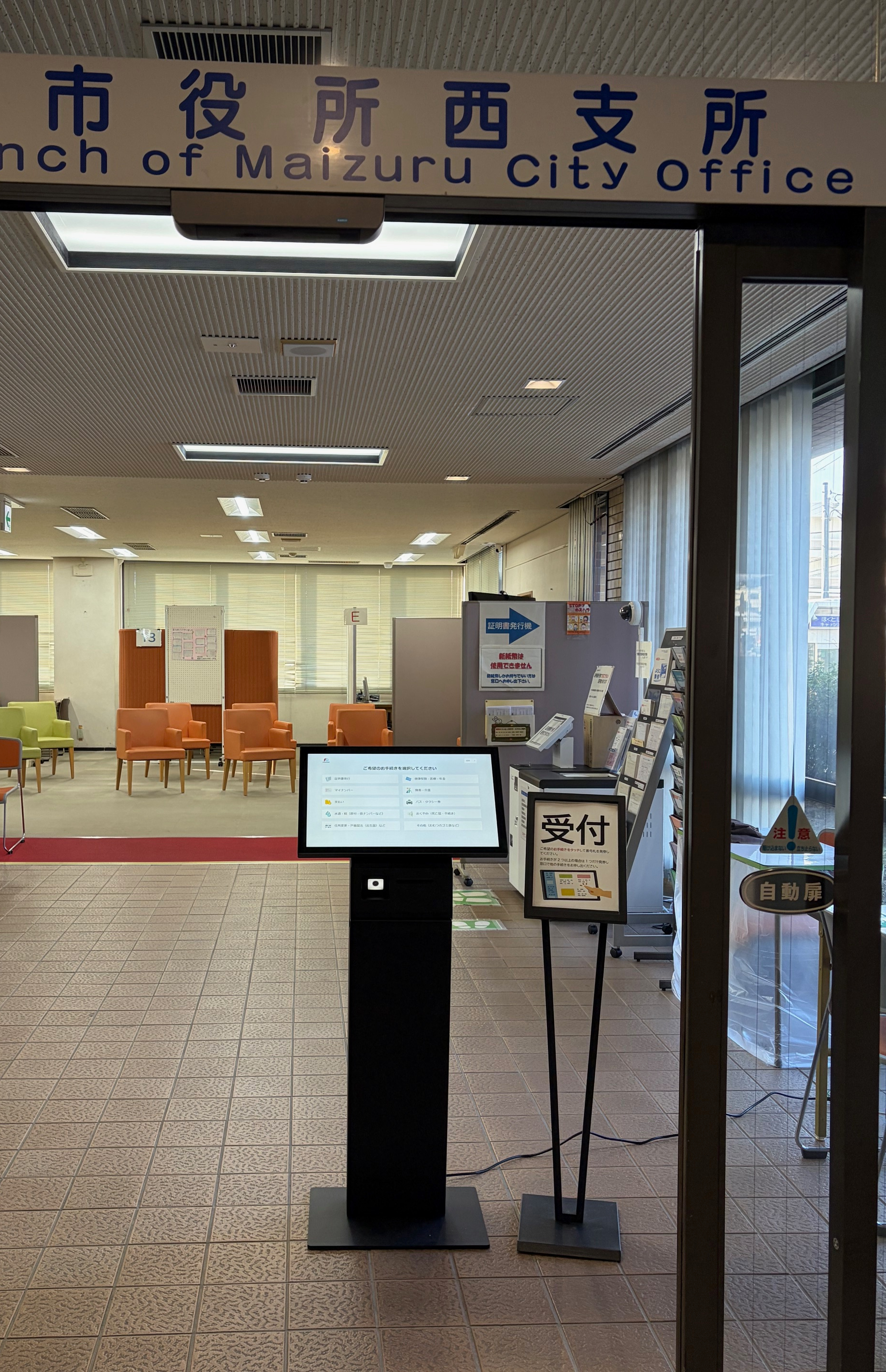 西支所に入ってすぐに、窓口案内・番号発券機を設置しています。