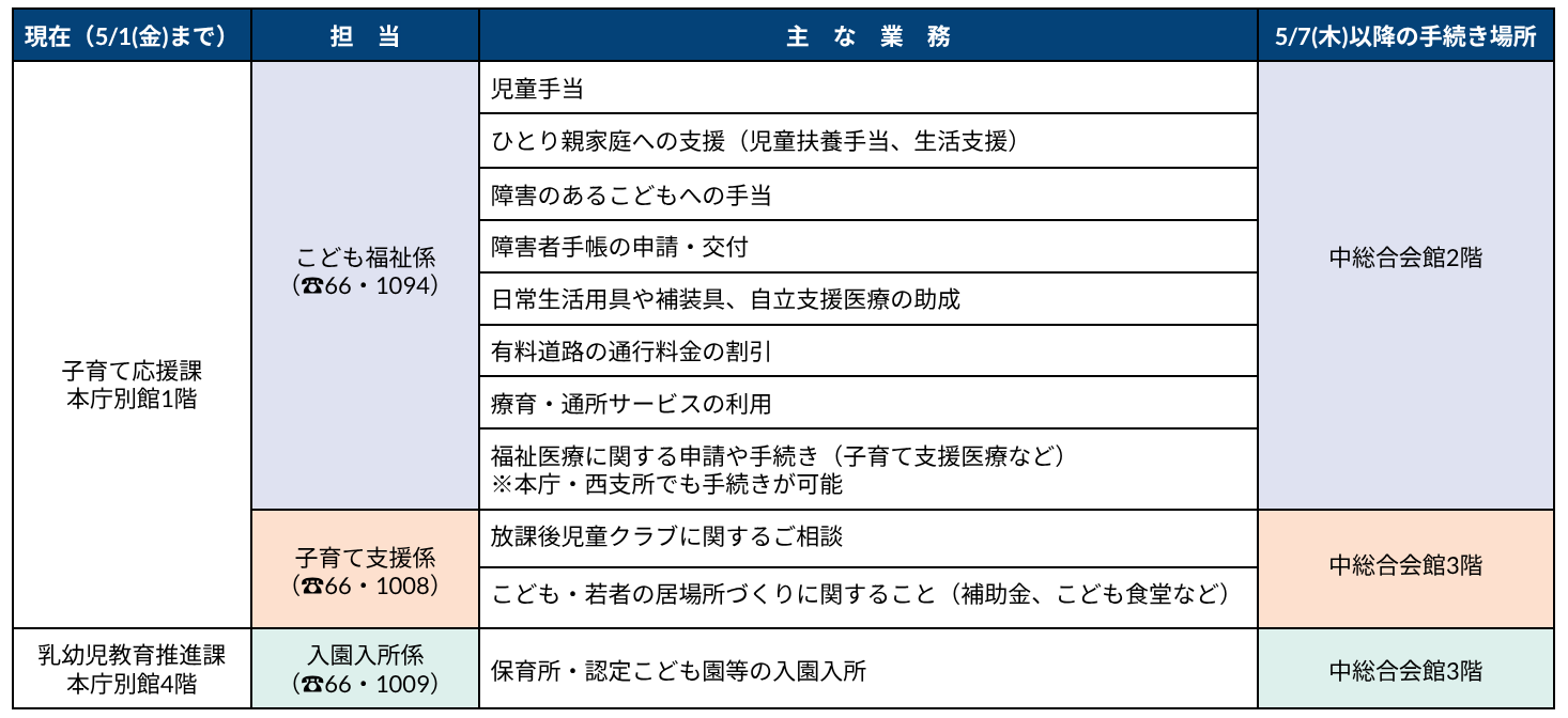 令和8年5月7日(木)に「子育て応援課」と「乳幼児教育推進課」が市役所本庁から移転します。