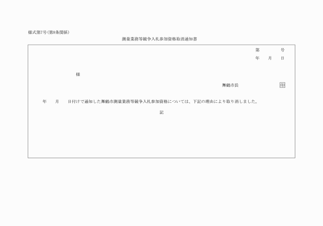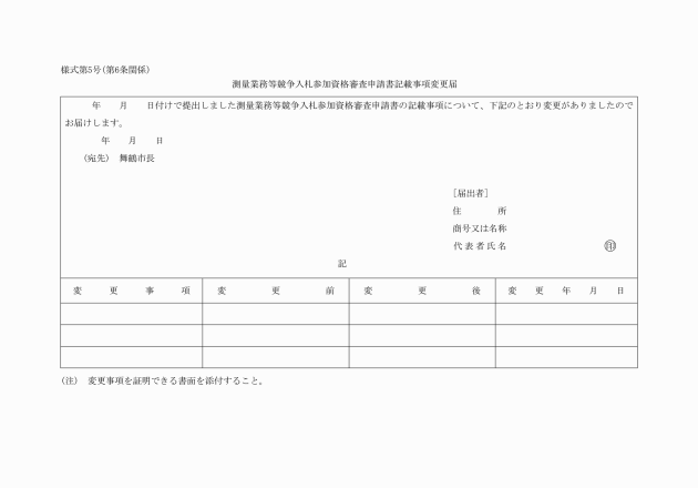 第6条 競争入札の参加資格を有する者(以下「資格者」という。)は、次に掲げる事項に変更があった場合においては、直ちに測量業務等競争入札参加資格審査申請書記載事項変更届(様式第5号)及び変更事項を証明する書類を市長に提出しなければならない。