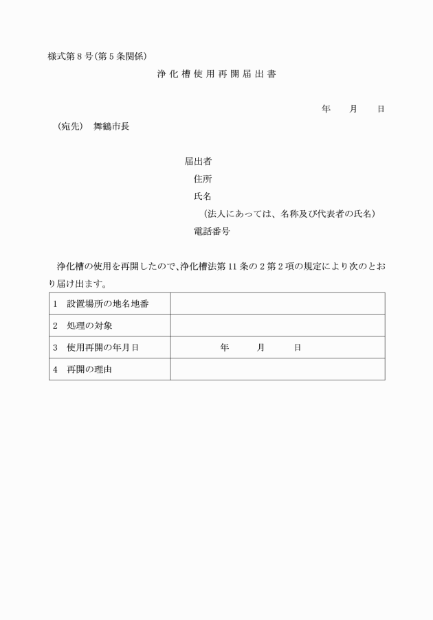 7 法第11条の2第2項に規定する浄化槽の使用の再開の届出 | 浄化槽使用再開届出書(様式第8号) | 正本1部 |