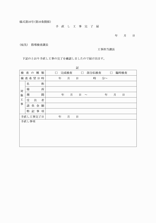 第9条 検査職員は、検査の結果、契約規則第46条第4項の規定により手直し工事が必要であると認めた場合は、検査結果報告書(様式第6号)により指導検査課長に報告しなければならない。
