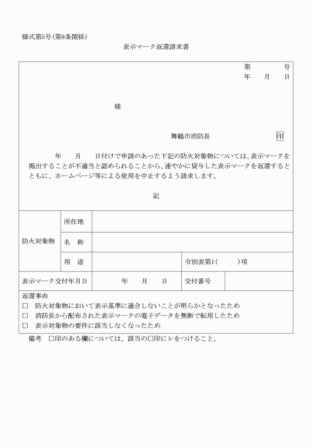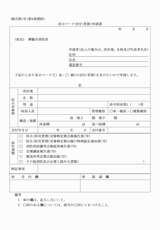 第5条 消防長は、前条第1項の規定により表示基準に適合すると認めた場合で、次に掲げるときは、別に定める表示マーク(銀)を交付し、又は更新する。