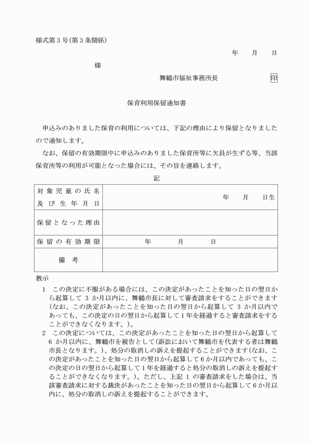 第2条 子ども・子育て支援法(平成24年法律第65号)第20条第4項に規定する教育・保育給付認定子ども(同法第19条第2号又は第3号に掲げる小学校就学前子どもに限る。以下「教育・保育給付認定子ども」という。)について、保育所、認定こども園又は家庭的保育事業等(家庭的保育事業、小規模保育事業、居宅訪問型保育事業又は事業所内保育事業をいう。)における保育の利用を希望する保護者は、保育利用申込書(様式第1号)を舞鶴市福祉事務所長(以下「所長」という。)に提出しなければならない。
