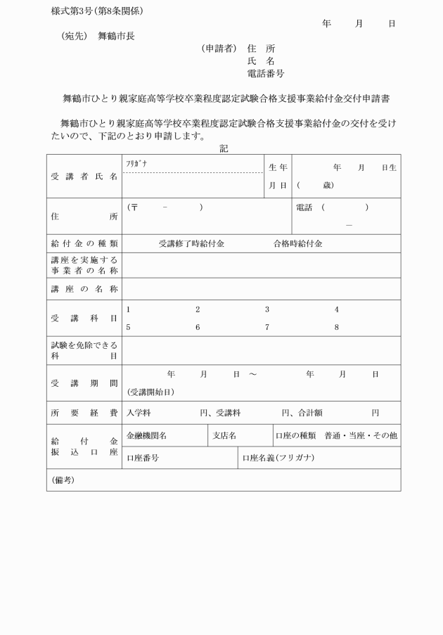 ○舞鶴市ひとり親家庭高等学校卒業程度認定試験合格支援事業給付金交付要綱