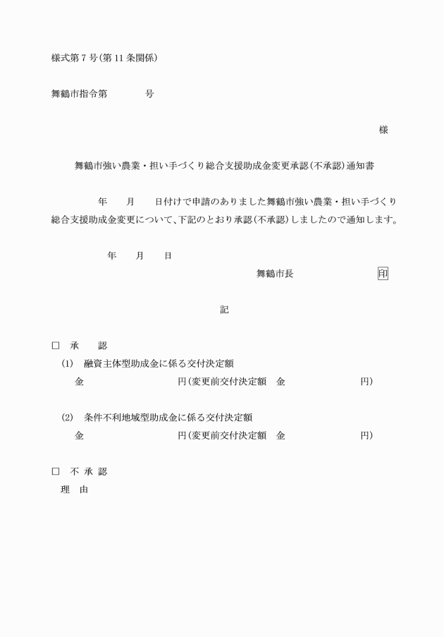 第12条 助成事業者は、助成事業を休止し、又は廃止しようとする場合は、舞鶴市強い農業・担い手づくり総合支援助成金休止(廃止)届(様式第8号)を遅滞なく市長に提出しなければならない。