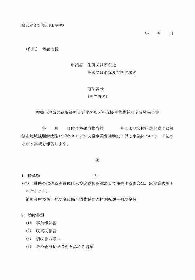 第15条 補助事業者は、補助事業完了後に消費税及び地方消費税の申告により補助金に係る消費税仕入控除税額が確定した場合には、速やかに消費税仕入控除税額確定報告書(様式第12号)を市長に提出しなければならない。