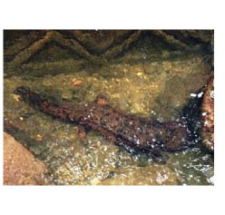 | ●日本固有種 ●国指定特別天然記念物(地域定めず) ●レッドデータ 環境省:準絶滅危惧(NT)、京都府:絶滅危惧種 世界最大の両生類 ●形態:体長50〜120cm。頭部に多数のイボ状突起がある。目と鼻孔は小さい ●分布:岐阜県以西の本州と四国、九州の一部 ●特徴:渓流に棲み、サワガニ、魚類、カエルなどを捕食する。8〜9月に川岸や石の下に巣穴をつくり数珠状の卵塊を産む。数は約500個。約3年で変態する。寿命100年。 |