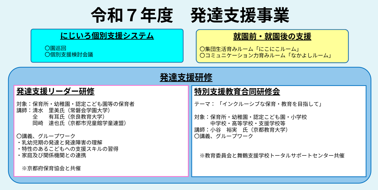 発達や障がいへの理解と支援方法、保護者支援等について基礎的な内容を学ぶ発達支援リーダー研修や、舞鶴支援学校トータルサポートセンターと市教育委員会との共催で実施している特別支援教育合同研修会を実施しています。