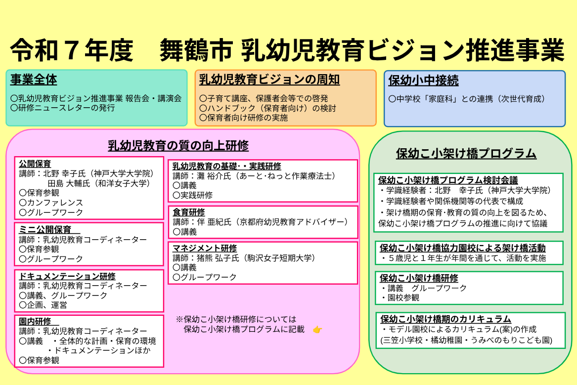 乳幼児教育センターでは、「舞鶴市乳幼児教育ビジョン」をもとに、乳幼児教育コーディネーターや発達支援教育コーディネーター、保幼こ小架け橋コーディネーター等を中心に乳幼児教育・発達支援に関する事業を実施しています。本ビジョンでは、「主体性を育む乳幼児教育の推進~みんなでつながり育む舞鶴のこども~」を基本理念とし、家庭や地域、保育所・幼稚園・認定こども園、小学校、中学校、行政等がこどもをまんなかにしてつながり合い、質の高い乳幼児教育を目指しています。