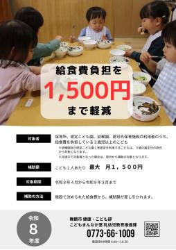 舞鶴市では、物価高騰の影響等を踏まえ、子育て世帯の経済的な負担を引き続き軽減するため、令和8年度における認可保育所・認定こども園・幼稚園・認可外保育施設の給食費の一部を補助します。