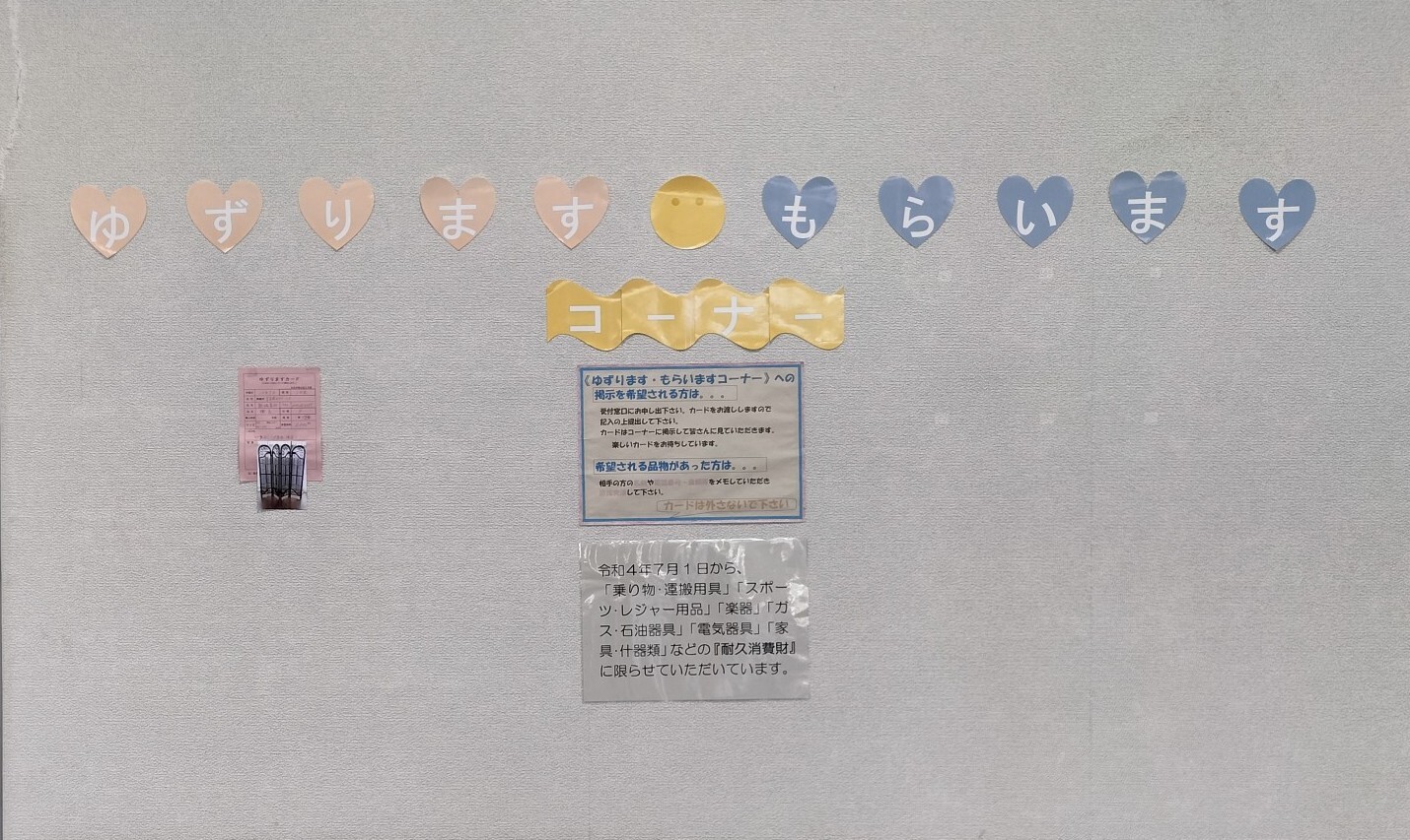 ゆずりたい方、もらいたい方ともリサイクルプラザに備え付けの用紙に品名等を記入していただき、掲示板に3ヶ月貼り出しています。