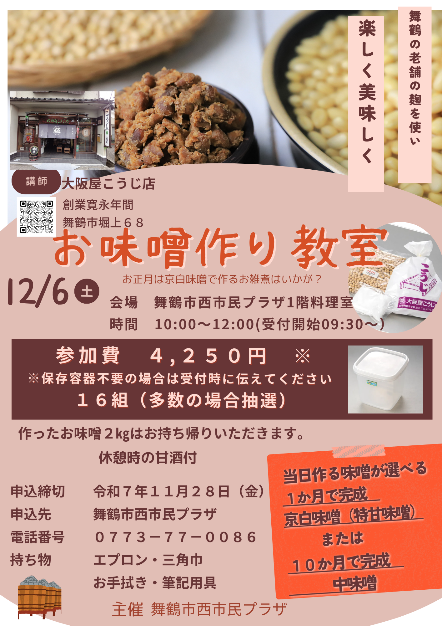 高齢者世代の誰でも参加できるお味噌作り教室を開催します。