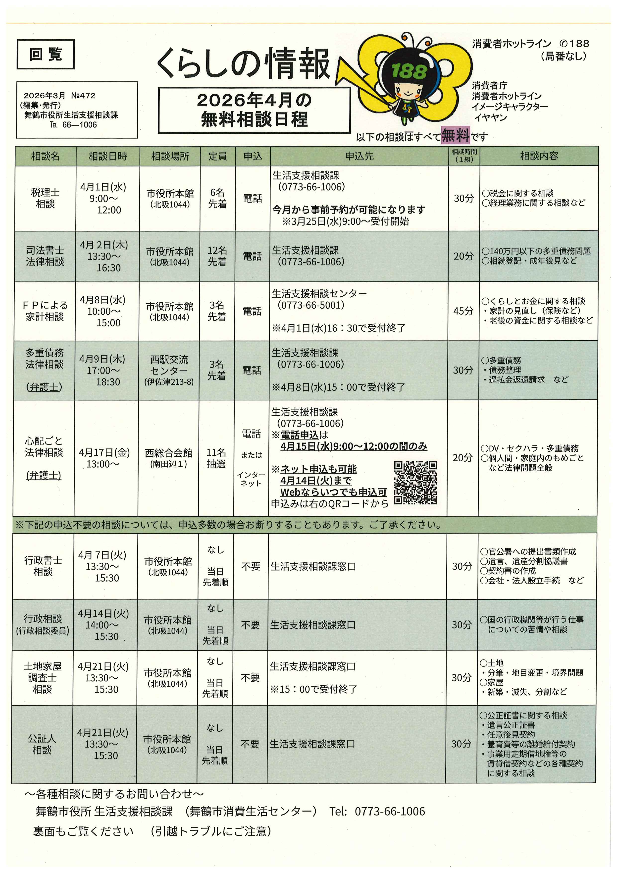 電話: 0773-66-5001(生活支援相談センター)、0773-66-1006(消費生活センター)、0773-65-0056(女性のための相談室)