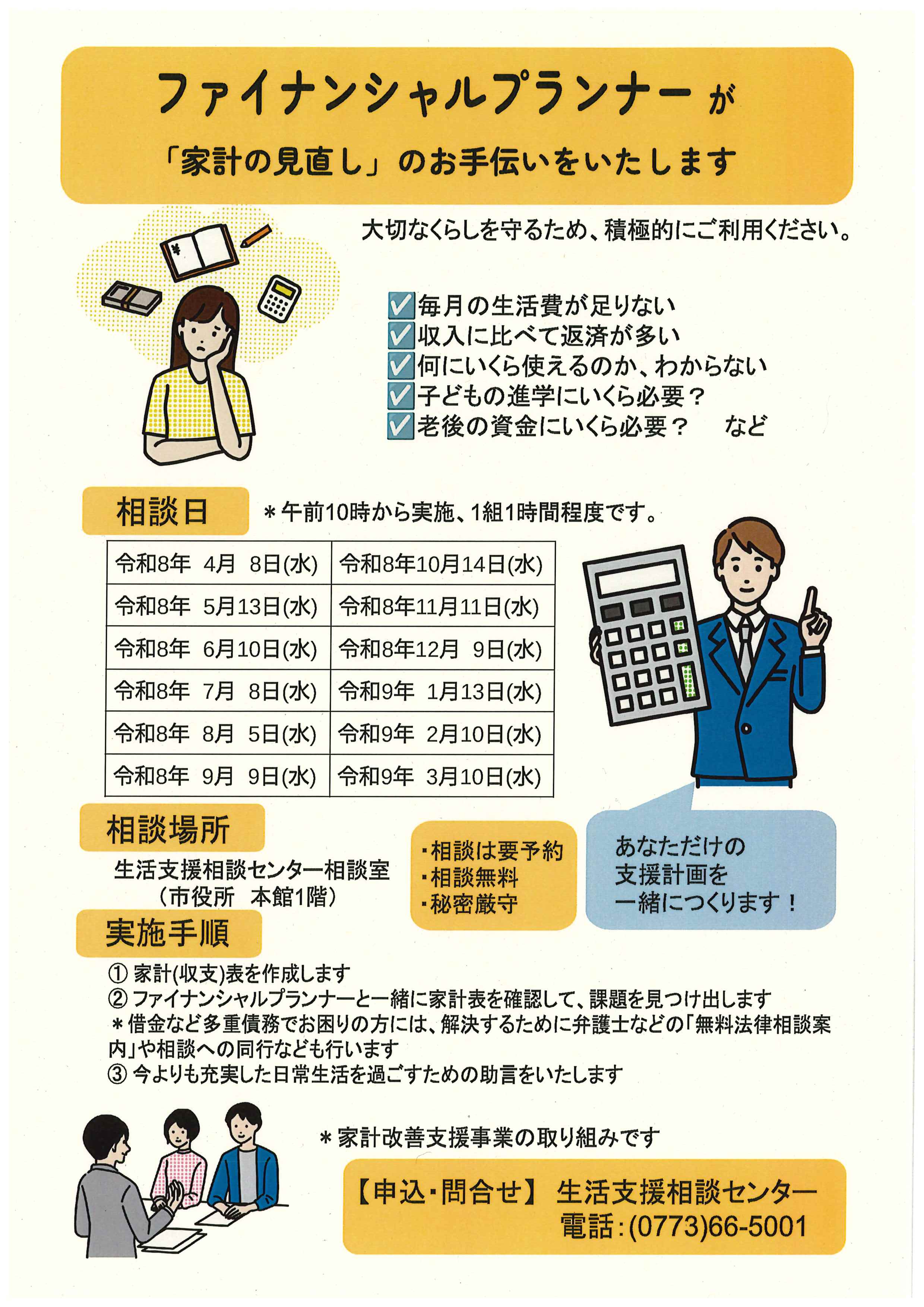 電話: 0773-66-5001(生活支援相談センター)、0773-66-1006(消費生活センター)、0773-65-0056(女性のための相談室)