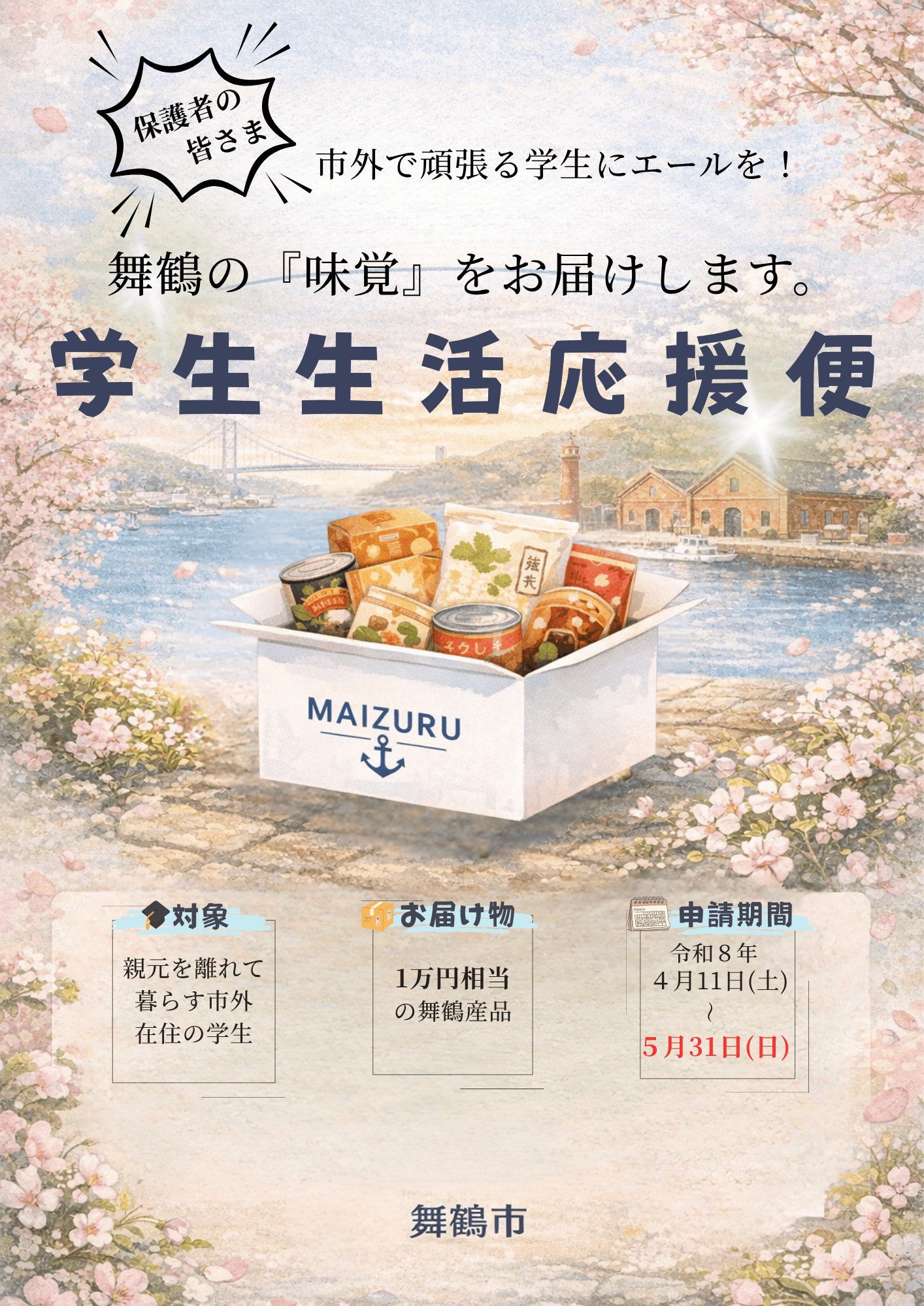 そこで舞鶴市では、市外で頑張る学生の皆さんの生活を応援するため、ふるさとの味を堪能できる「舞鶴産品(1万円相当)」を学生のお住まいへお送りします。