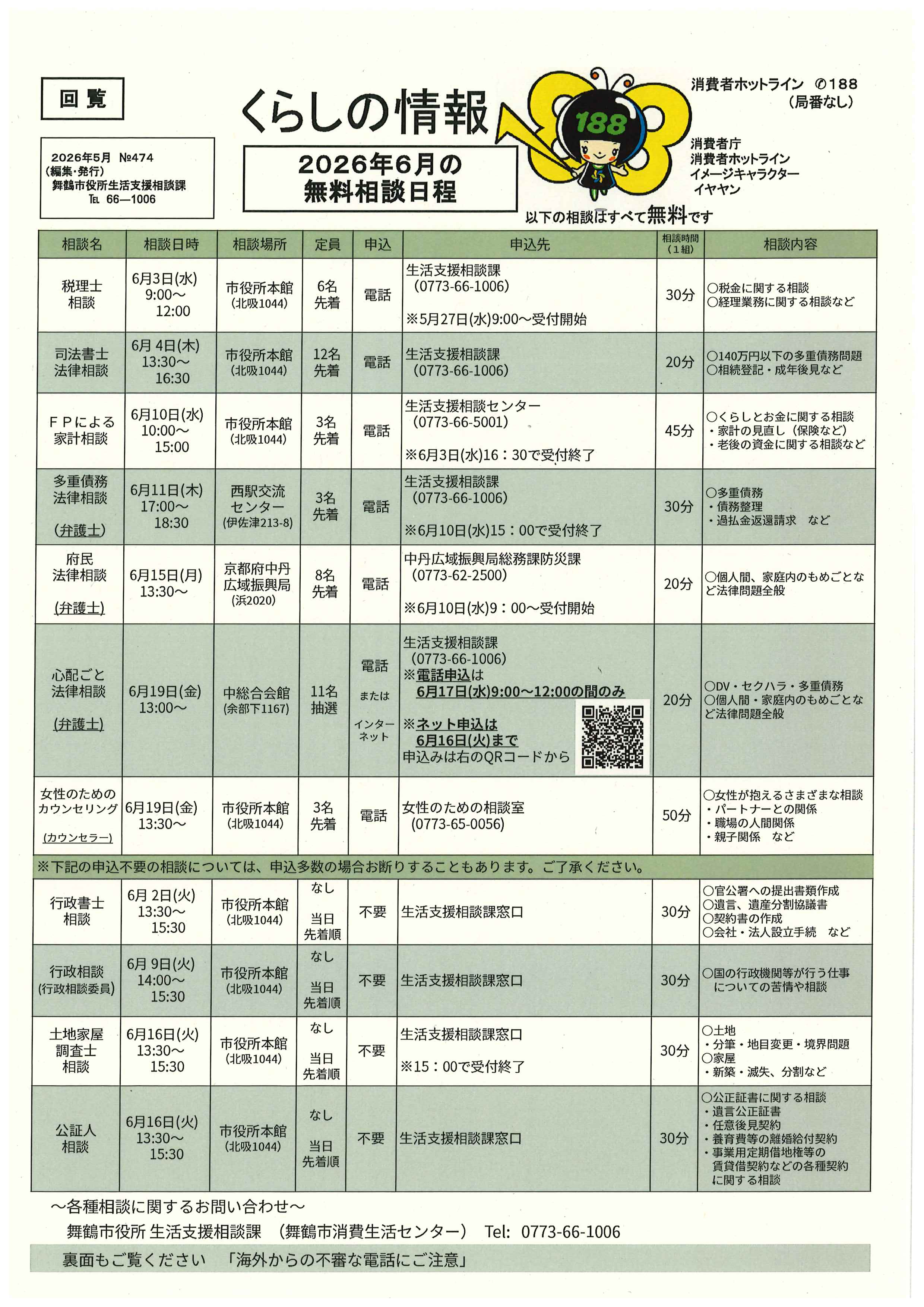 電話: 0773-66-5001(生活支援相談センター)、0773-66-1006(消費生活センター)、0773-65-0056(女性のための相談室)