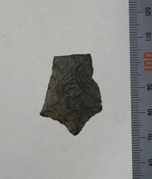 有舌尖頭器は、根元の部分に舌状の茎(なかご:柄に差し込む部分)があることからこのように呼ばれました。用途は槍の先につける穂先と考えられています。女布遺跡の有舌尖頭器は、サヌカイトを原石とし、下森神社周辺の畑で採集されました。槍先・根元部分ともに先端部が欠損していますが、復原すると完形状態で5cm程の長さがあったと思われます。 この有舌尖頭器は、小橋遺跡で出土した有舌尖頭器と同じく縄文時代草創期(約1万2000年前)の舞鶴に人類が居住していたことを示す貴重な資料です。 |