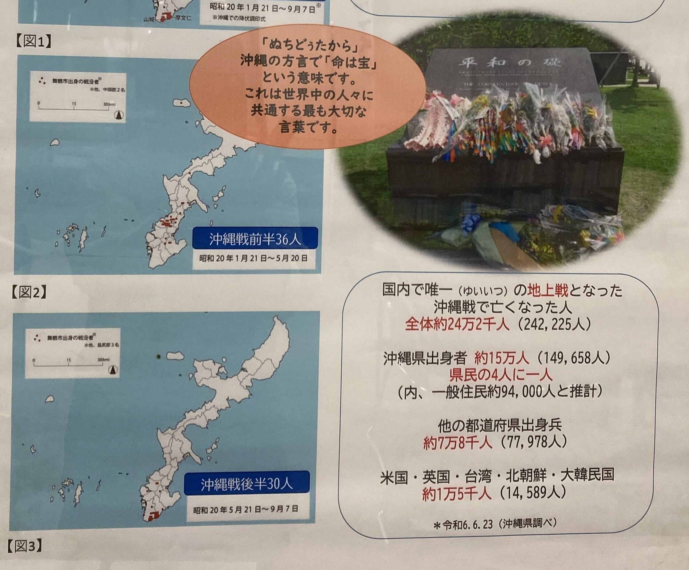 舞鶴市出身の沖縄戦戦没者を京都府立大学文学部が調査し、その成果をサロンスペースにて展示しています。府立大学では同様の調査結果を長岡京市・京丹後市などの他の市町村でも発表しており、舞鶴でも当資料館で展示解説を行いますので関心のある方はぜひご参加ください。