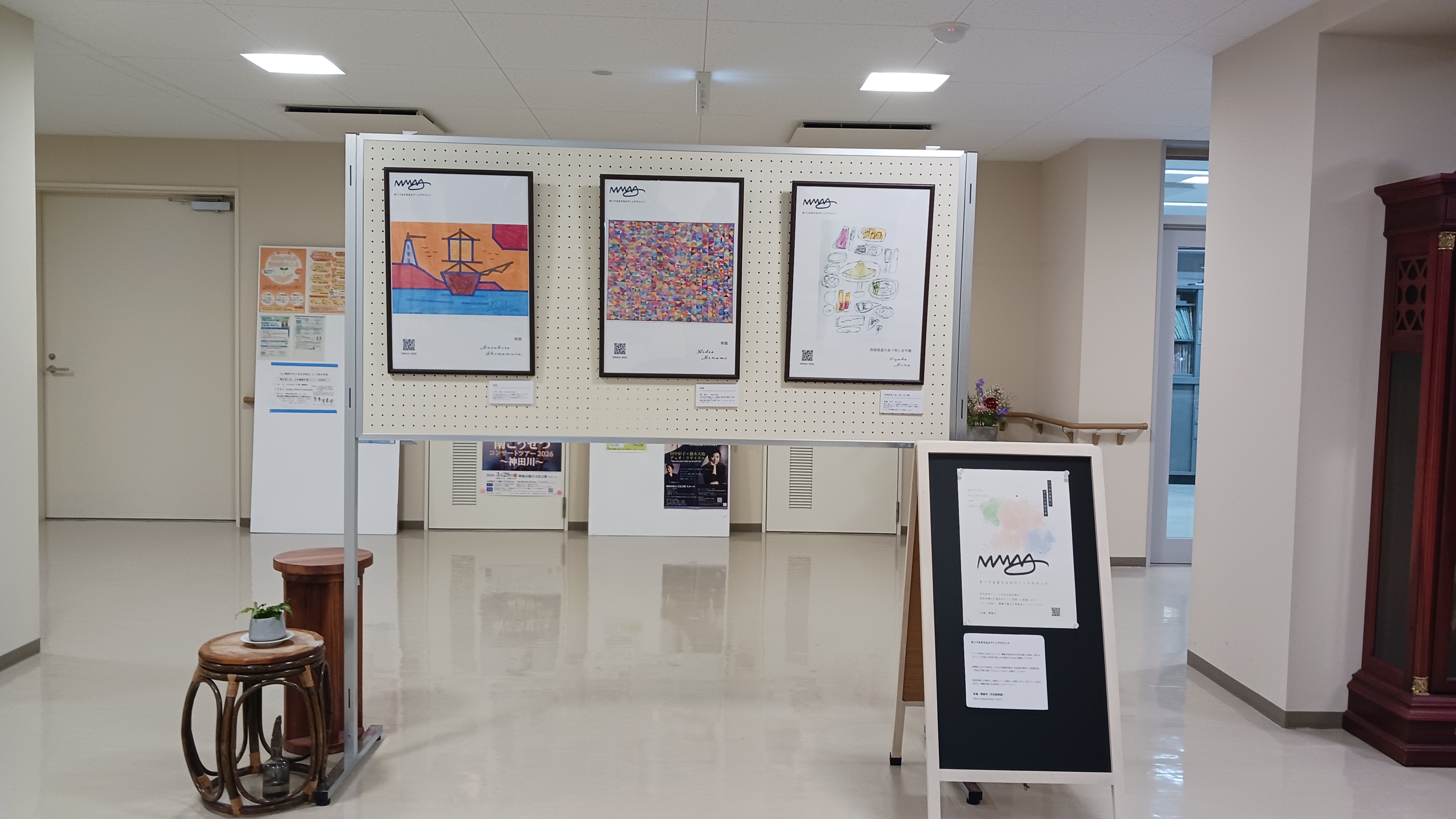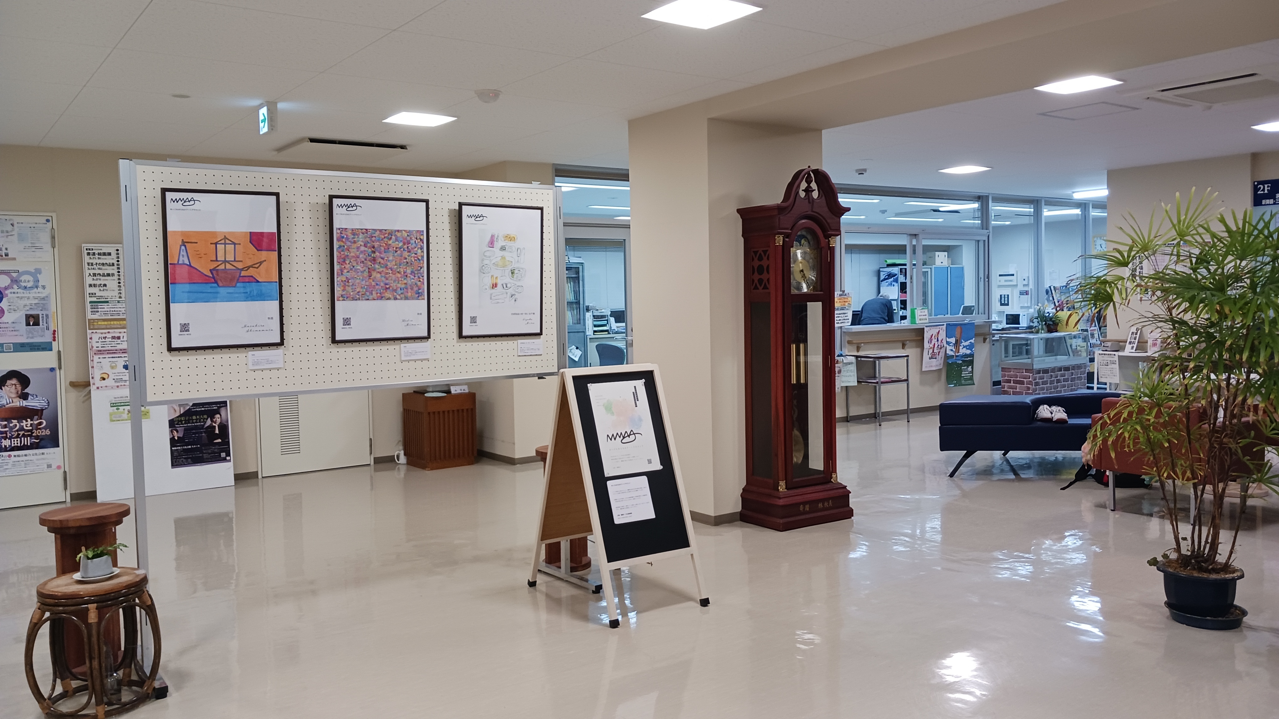 今年度は、みずなぎ鹿原学園の利用者が製作した絵画作品(作品を写真に撮りパネルにしたもの)を展示します。