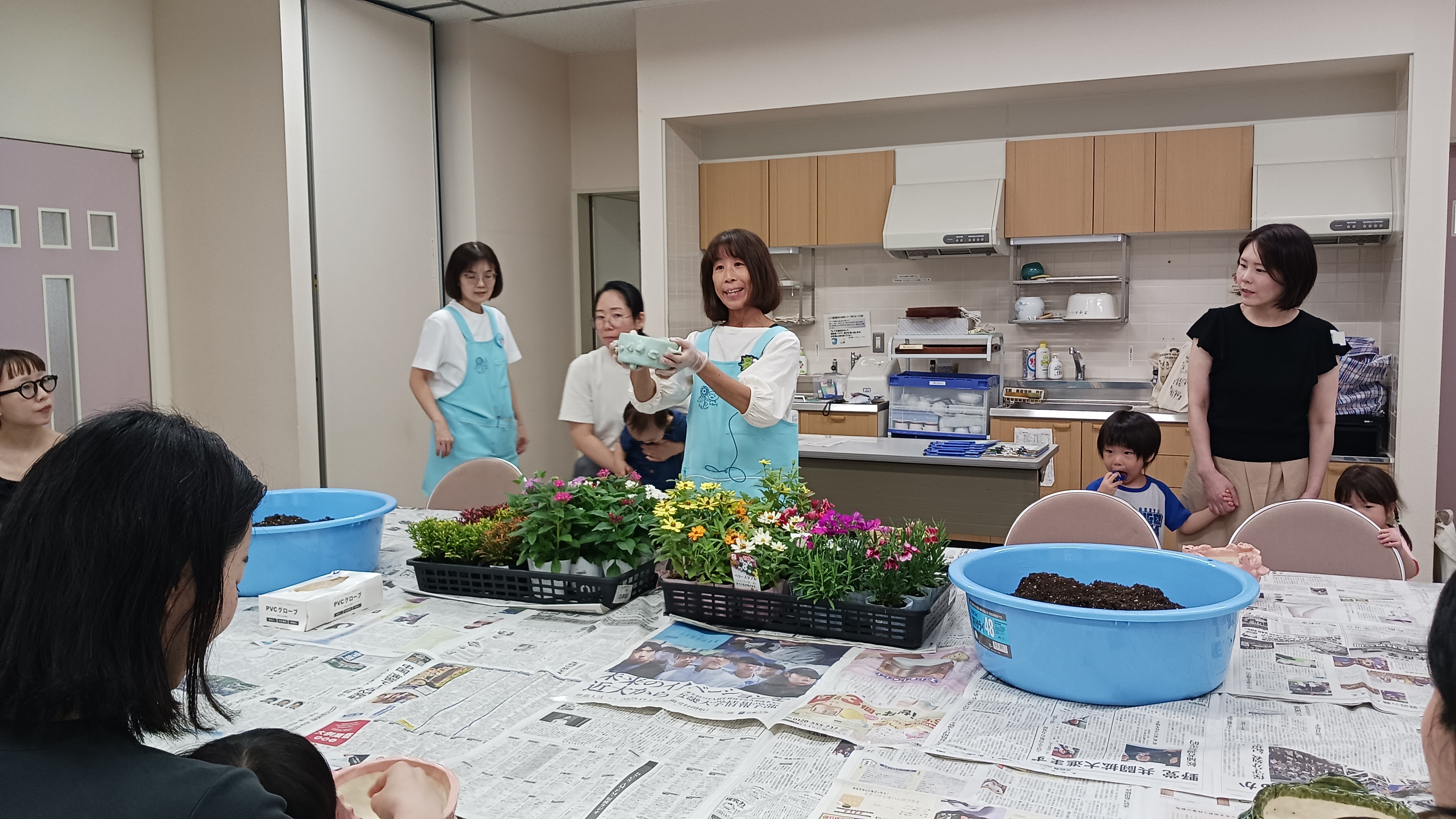 この日は、舞鶴産の花苗を手作りの植木鉢に親子で植えました。