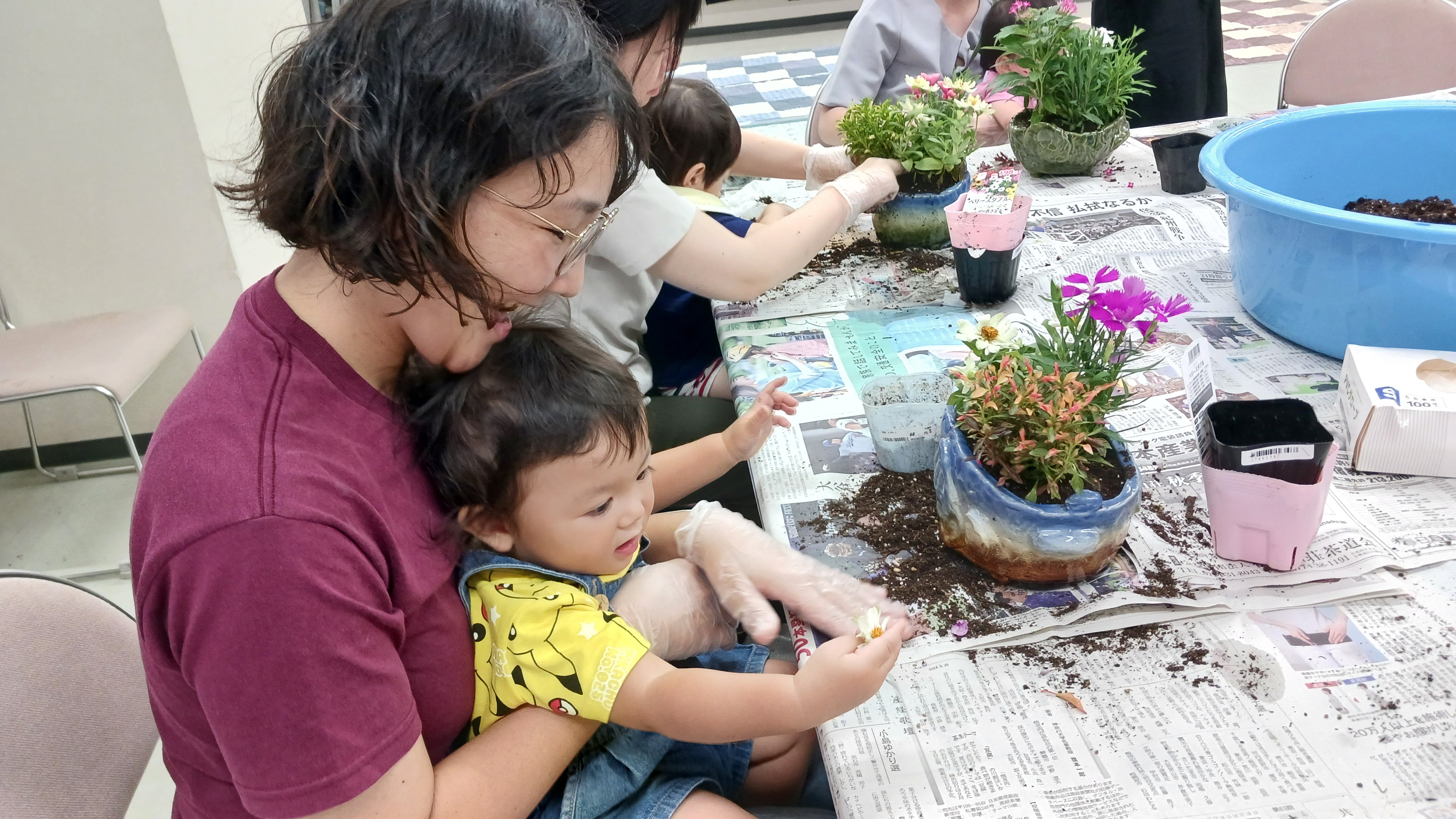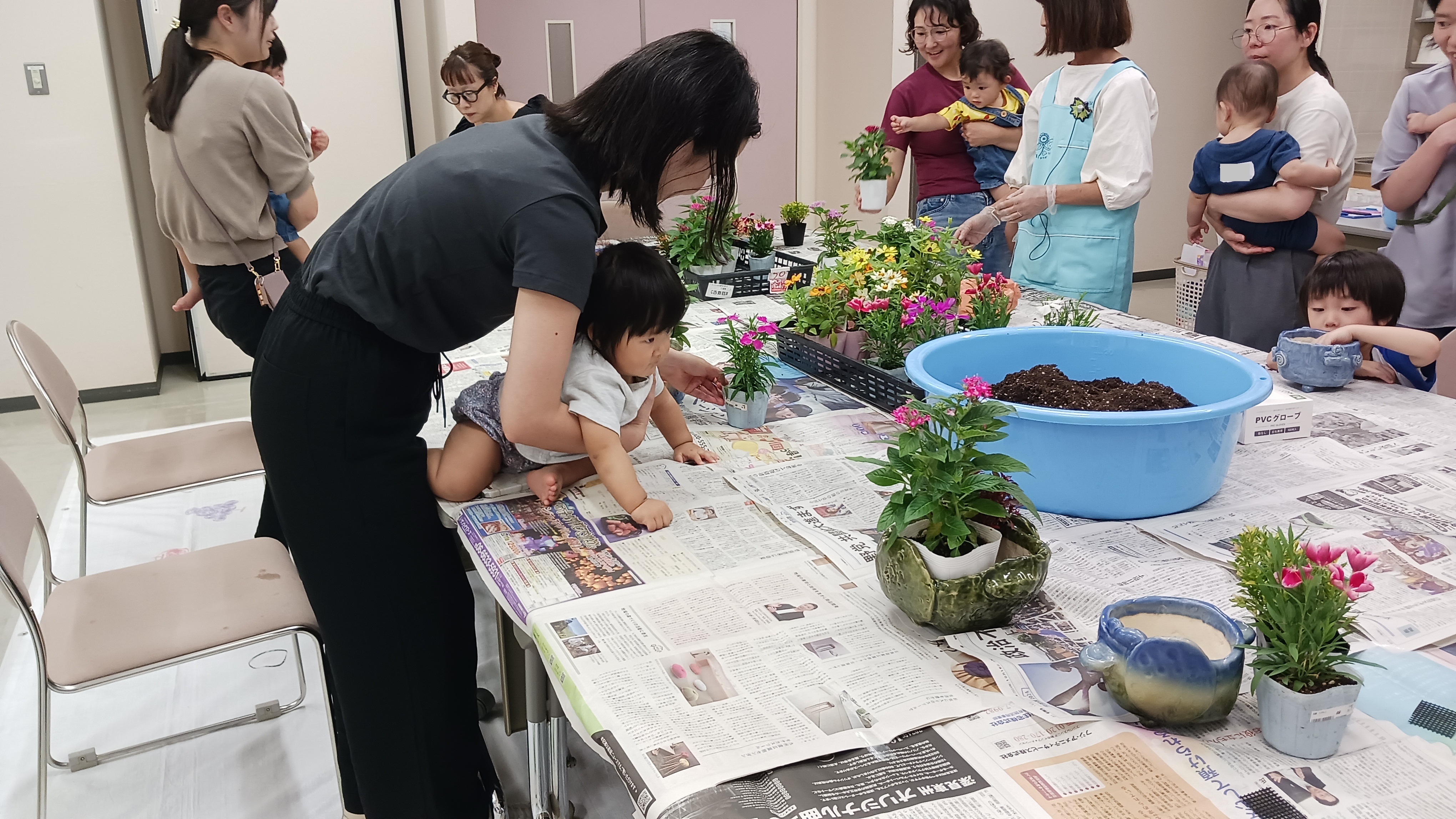 △赤ちゃんも身を乗り出して花植えに熱中しています!
