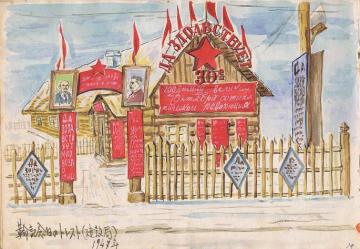 抑留中の昭和22年(1947)ごろにソ連軍からイルクーツクのメーデーの様子を描いてくるよう命令され、その際に渡された2冊のスケッチブックのうち1冊をもらい受け収容所や町の様子を描いた。唯一、抑留中に描かれた記録画。