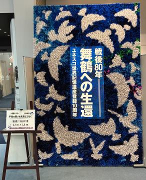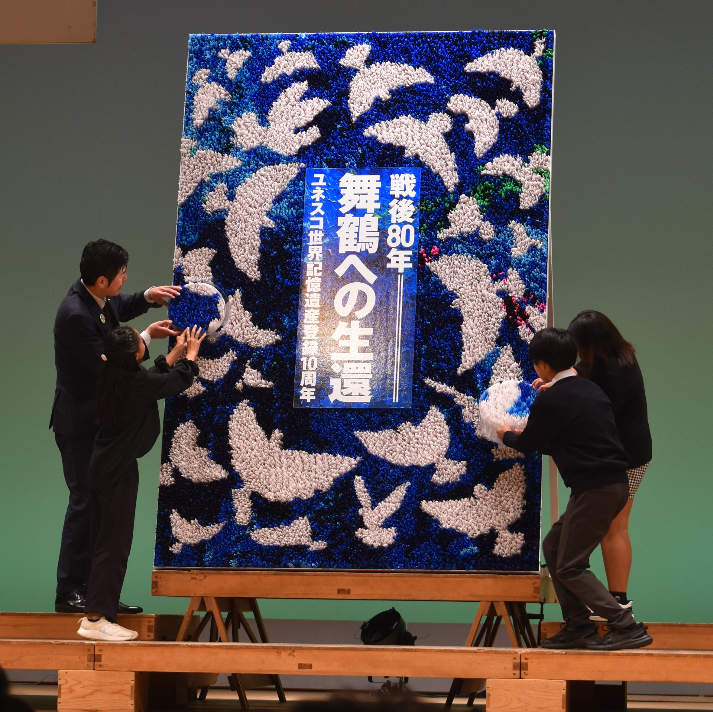 戦後80年、海外引揚80年、ユネスコ世界記憶遺産登録10周年という大きな節目に、引き揚げのまち舞鶴からまちぐるみで平和の願いを発信する取り組みとして、市民の皆さんや市外、府外の皆さんに折っていただいた折り鶴で「折り鶴アート」制作し、10/12(日)の平和祈念式典(会場:舞鶴市総合文化会館)で、完成披露をおこないました✨️