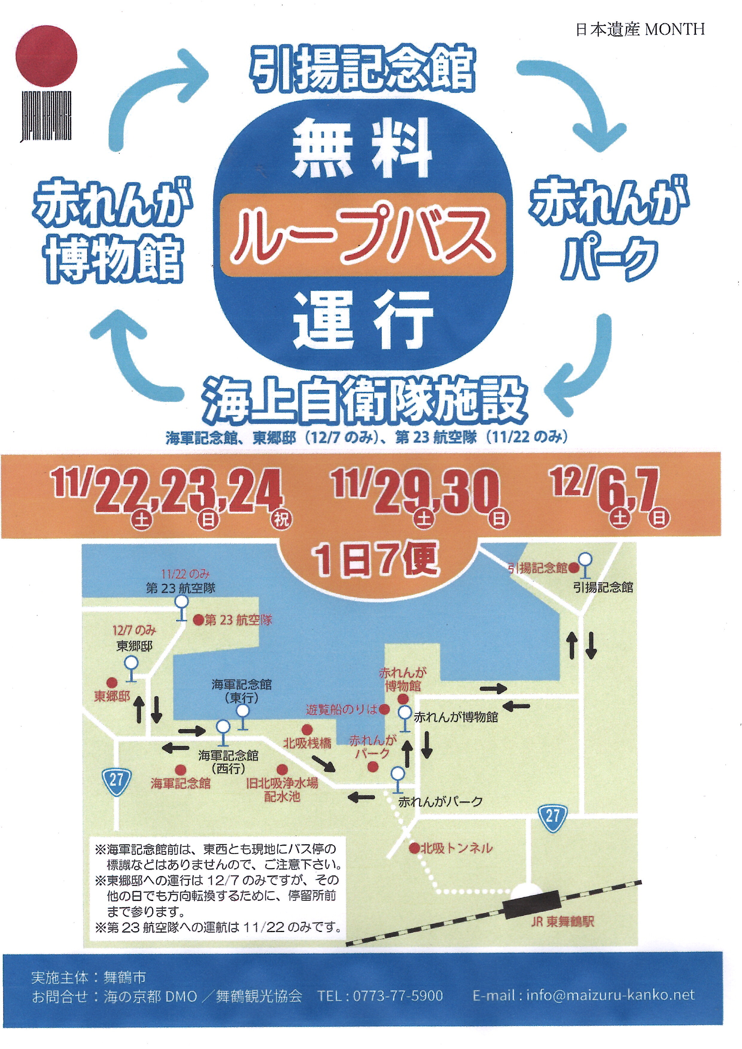 「鎮守府 横須賀・呉・佐世保・舞鶴〜日本近代化の躍動を体感できるまち〜」のストーリーを国内外に発信することを目的として、11/22(土)〜12/7(日)の「日本遺産MONTH」にあわせて、舞鶴赤れんがパークを拠点に海上自衛隊施設や赤れんが博物館、そして舞鶴引揚記念館をつなぐ無料周遊ループバスを運行します。
