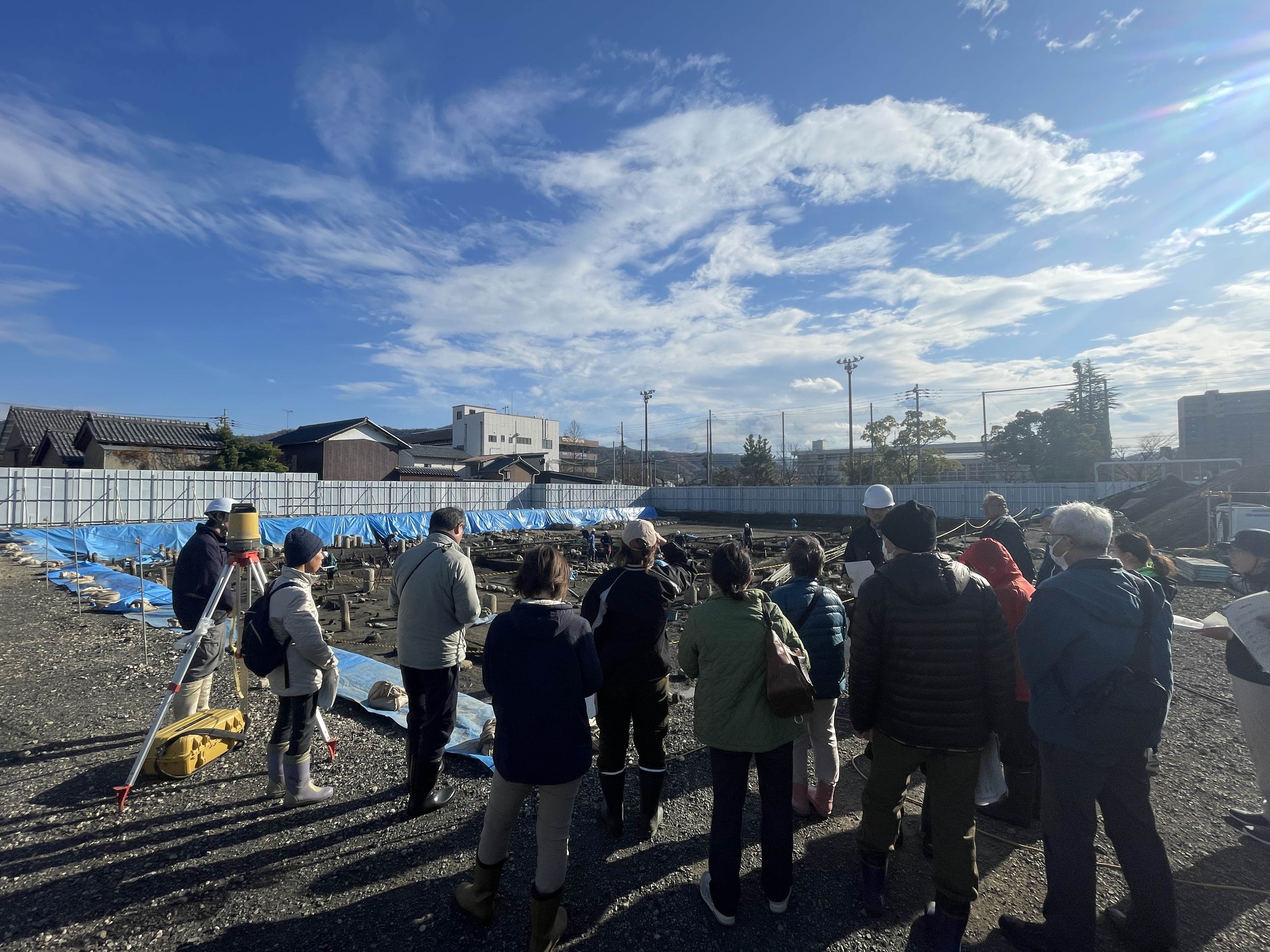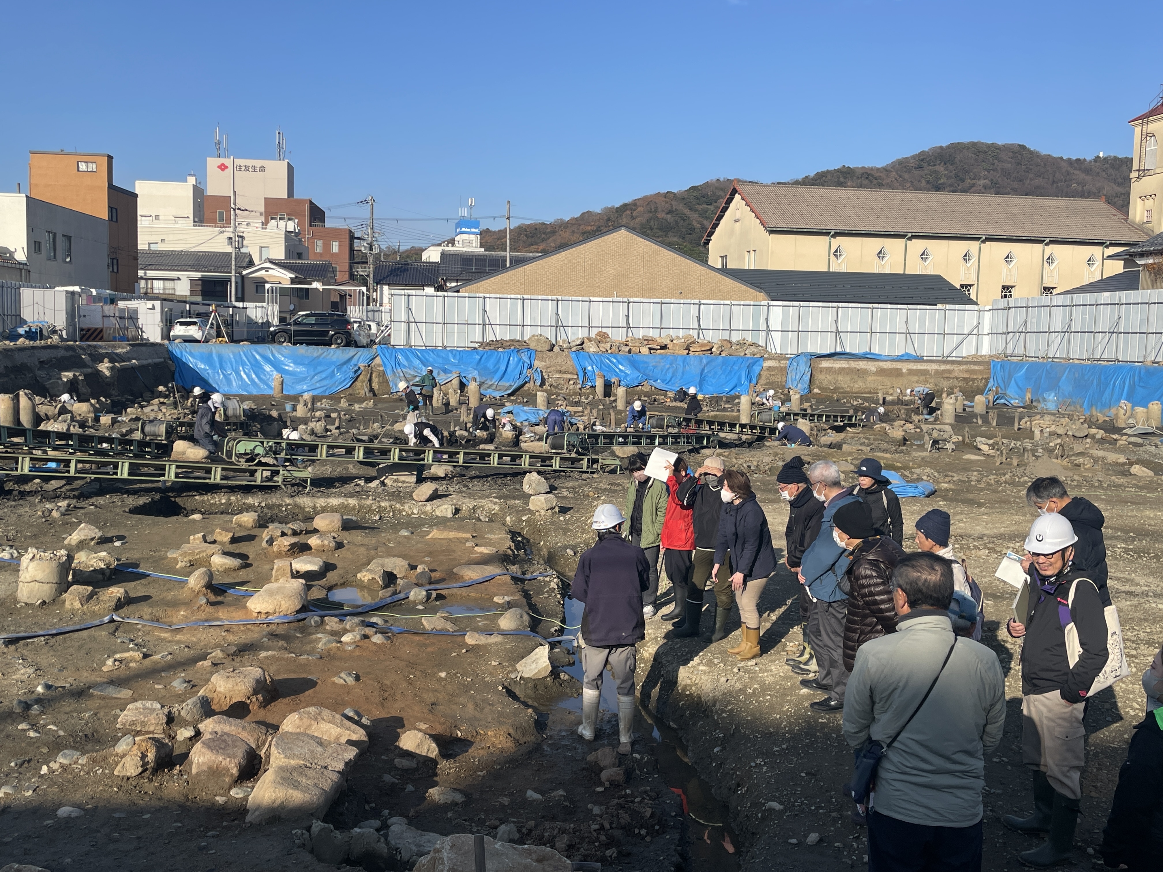 今回の講座では、(公財)京都府埋蔵文化財調査研究センターが現在行っている田辺城跡発掘調査現場を見学し、生の発掘現場の臨場感を肌で感じながら、発掘成果の一部を御覧いただきました。