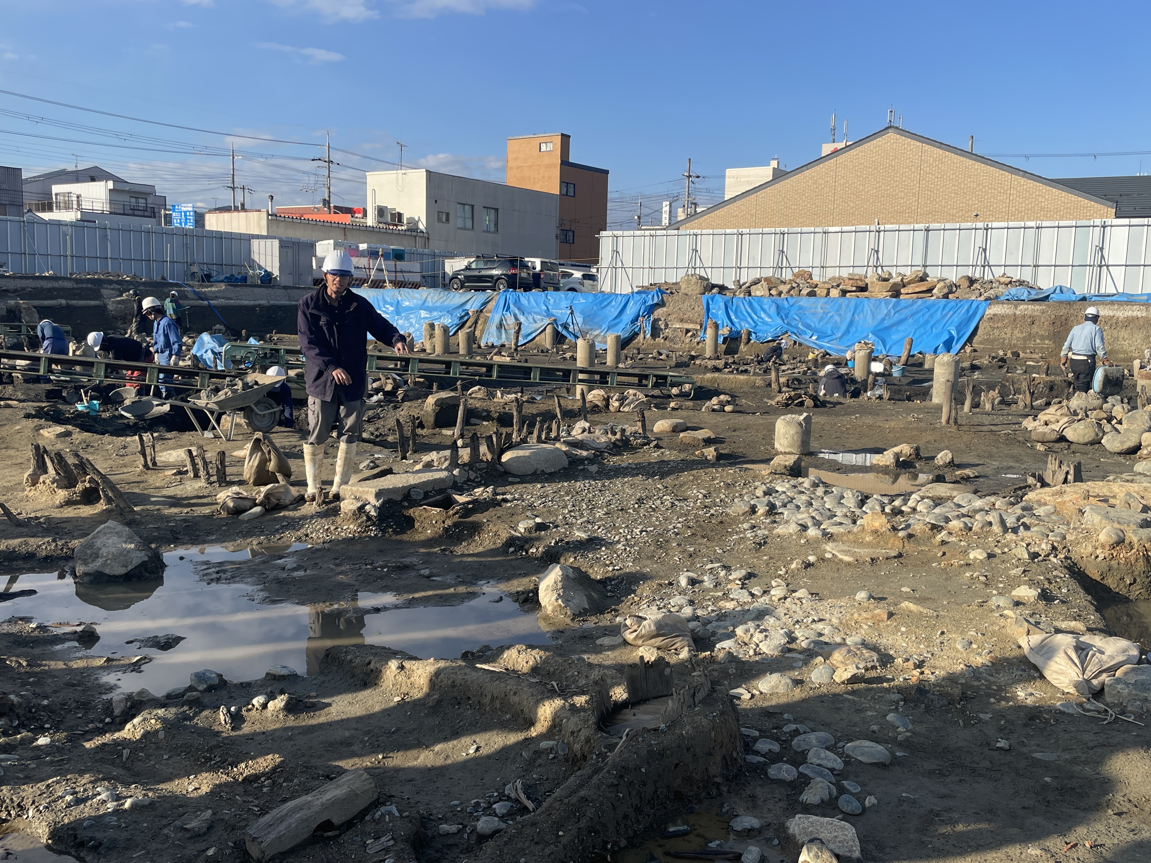 △武家屋敷内では、上水施設や庭園の池跡とみられる礫敷き遺構なども見つかりました。