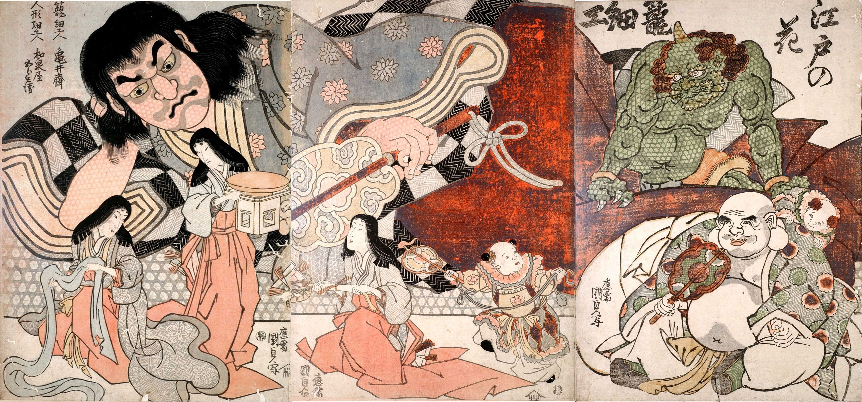 江戸時代は見世物小屋が大はやり!見世物はお祭りや大きなお寺の近くなど、人がたくさん集まる場所にテントや小屋を建てて行われていました。そこでは「びっくりするもの、珍しいもの、すごい技」が見られたのです。その一つが、竹などを編んで作る大きな「籠細工」!頬杖をつく酒呑童子と、ひょっこり覗く緑色の鬼が籠細工です。あれっ? 画面の右にはなぜか布袋さんが座っています。これが源頼光でしょうか?刀でなくにっこり笑ってやっつけるのかな?