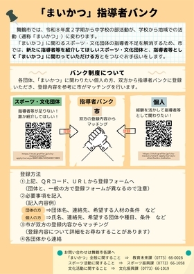舞鶴市では、令和8年度2学期から休日の中学校の部活動が地域での活動(通称「まいかつ」)へと移行します。この「まいかつ」を支えるスポーツ・文化団体の指導者不足を解消するため、『指導者バンク』を開設しました。「指導者等(指導者・スタッフ)を紹介して欲しいスポーツ・文化団体」と、「指導者として活躍したい方」をつなぐお手伝いをすることで、子ども達が継続してスポーツ・文化活動に親しめる環境づくりを進めていきます。
