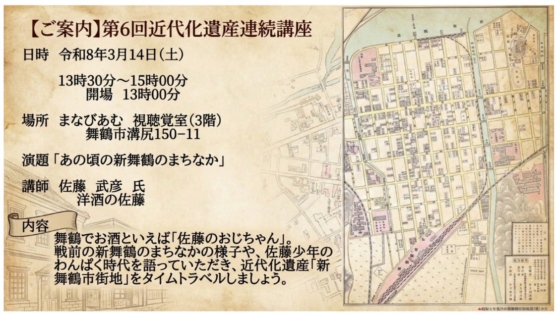 舞鶴でお酒といえば「佐藤のおじちゃん」。戦前の新舞鶴のまちなかの様子や、佐藤少年のわんぱく時代を語っていただき、近代化遺産「新舞鶴市街地」をタイムトラベルしましょう。
