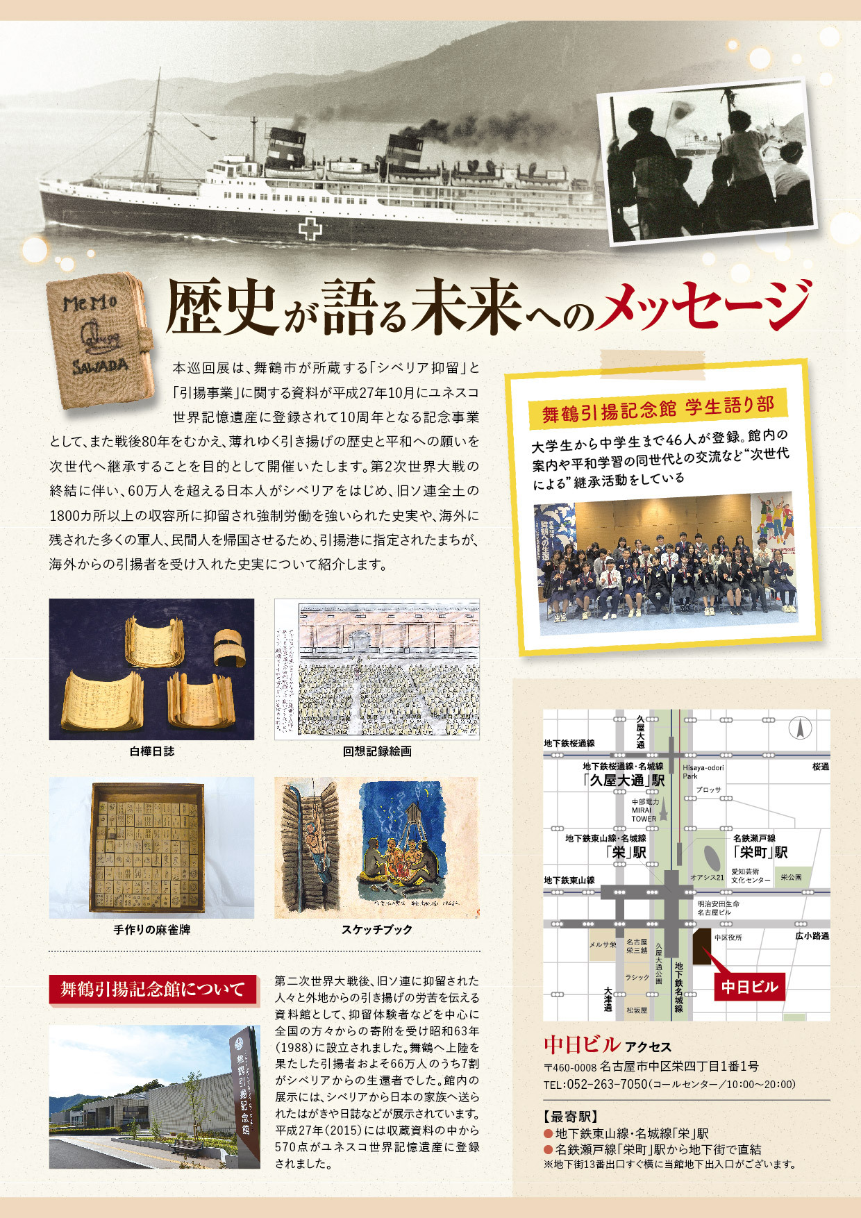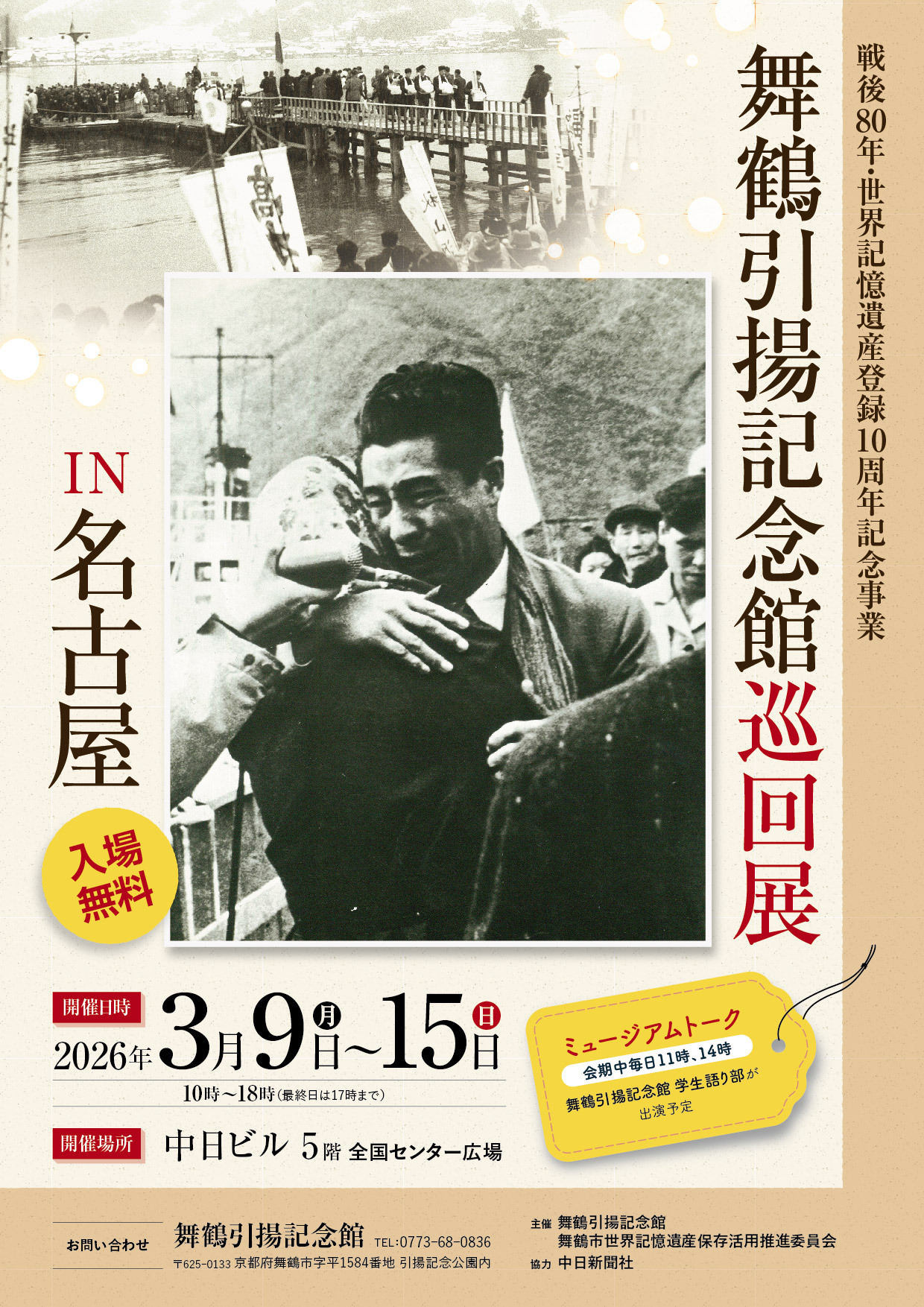 令和7年度に展開してきた戦後80年・ユネスコ世界記憶遺産登録10周年の記念事業として、戦後、舞鶴と同じく引揚港として約26万人の引揚者を迎え入れた名古屋で、舞鶴引揚記念館が収蔵する「引き揚げ」や「シベリア抑留」の関連資料を展示する巡回展を開催します。お近くにお越しの際には、ぜひお立ち寄りください!