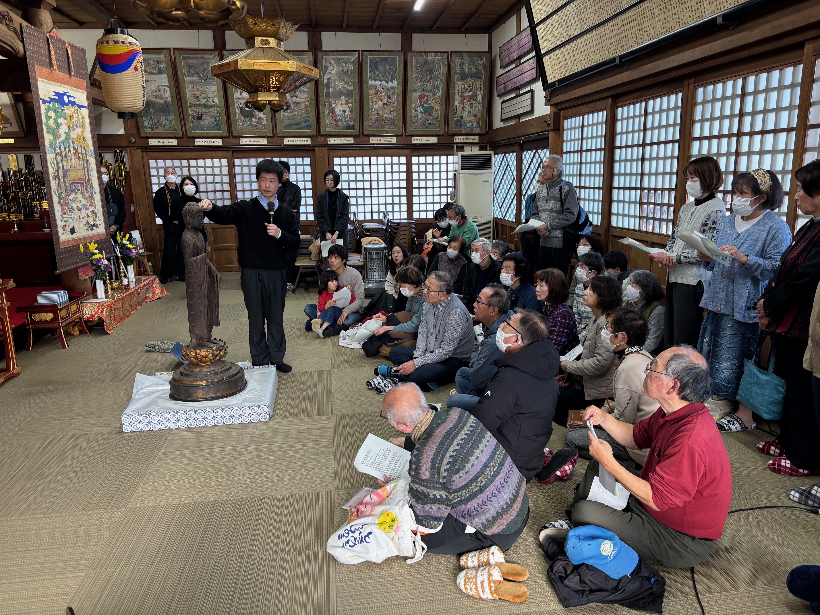 △大聖寺にて檀家のみなさんも加わり、お像を前に解説を聞きます。※講座のため特別に壇上からお出ましいただきました。