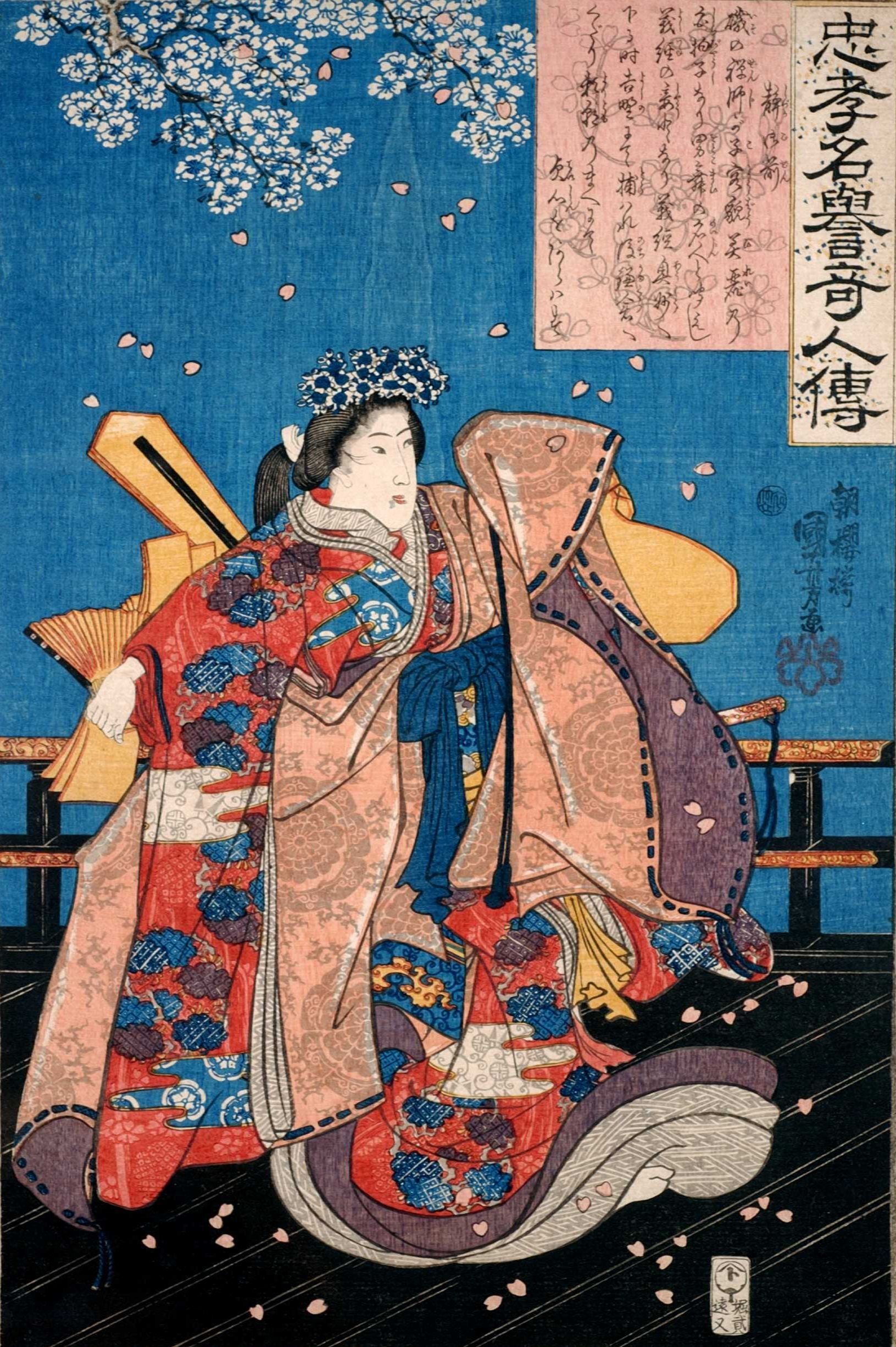 今月の糸井文庫は「桜」です。満開の桜は一時の輝きですが、咲き始めから葉桜になるまで、四月はずっと桜を愛でることができます。浮世絵は歌舞伎とともに発展しました。 歌舞伎で桜といえば、まずは「義経千本桜」。そして「楼門五三桐」で石川五右衛門が満開の桜を前に「絶景かな、絶景かな」と見得を切る、有名な場面を思い浮かべる方も多いでしょう。これらは江戸時代だけでなく現在でも人気の演目です。今月は義経の恋人静御前や石川五右衛門と桜をお送りします。