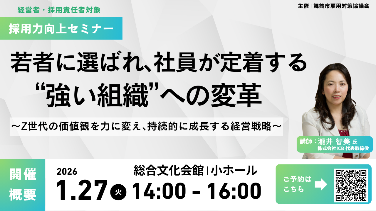 「若者に選ばれ、社員が定着する『強い組織』への変革 ~Z世代の価値観を力に変え、持続的に成長する経営戦略~」をテーマに、経営者・採用責任者を対象とした「採用力向上セミナー」を実施します。