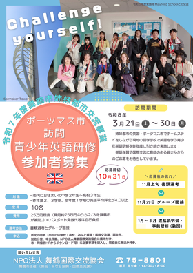 本事業は、令和8(2026)年3月21日(土)~30日(月)に市内の中高生がポーツマス市を訪問し、ホームステイをしながら、語学学校での英語研修や現地の学校を訪問しての交流会などを通じて英語を学ぶもの。昨年度に引き続いての実施となります。