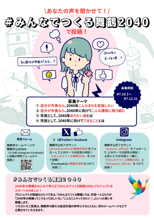 どのテーマへの回答か明記し、「#みんなでつくる舞鶴2040」及び「@舞鶴市役所」をつけて投稿