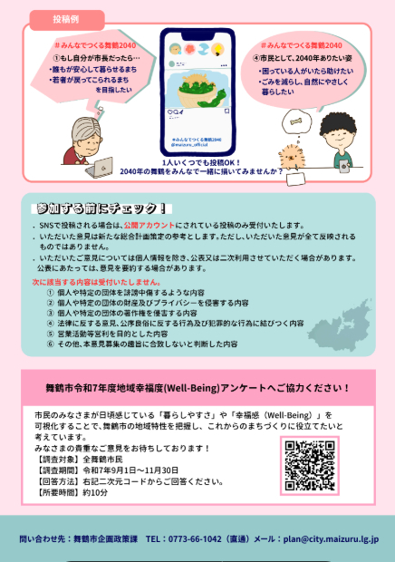 どのテーマへの回答か明記し、「#みんなでつくる舞鶴2040」をつけて投稿