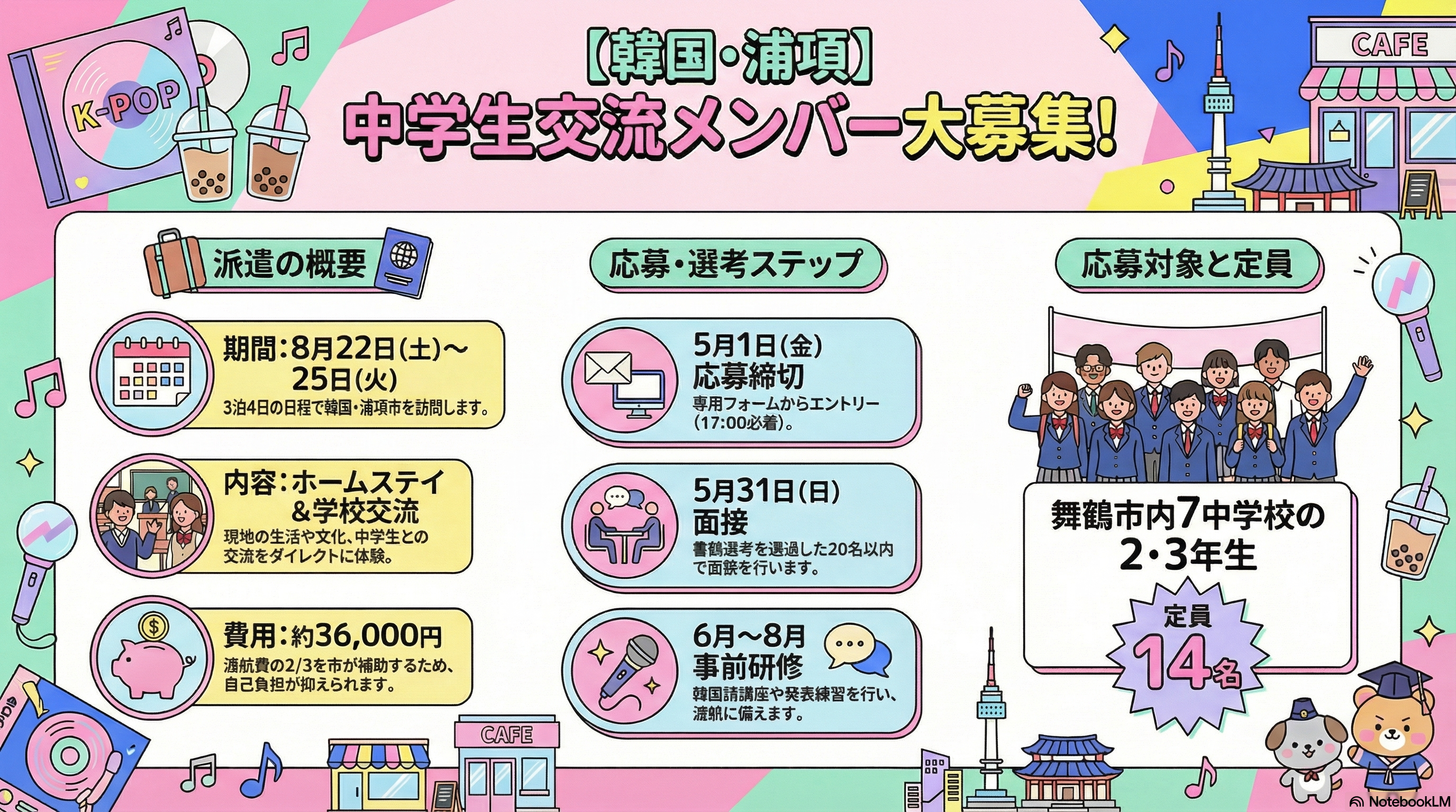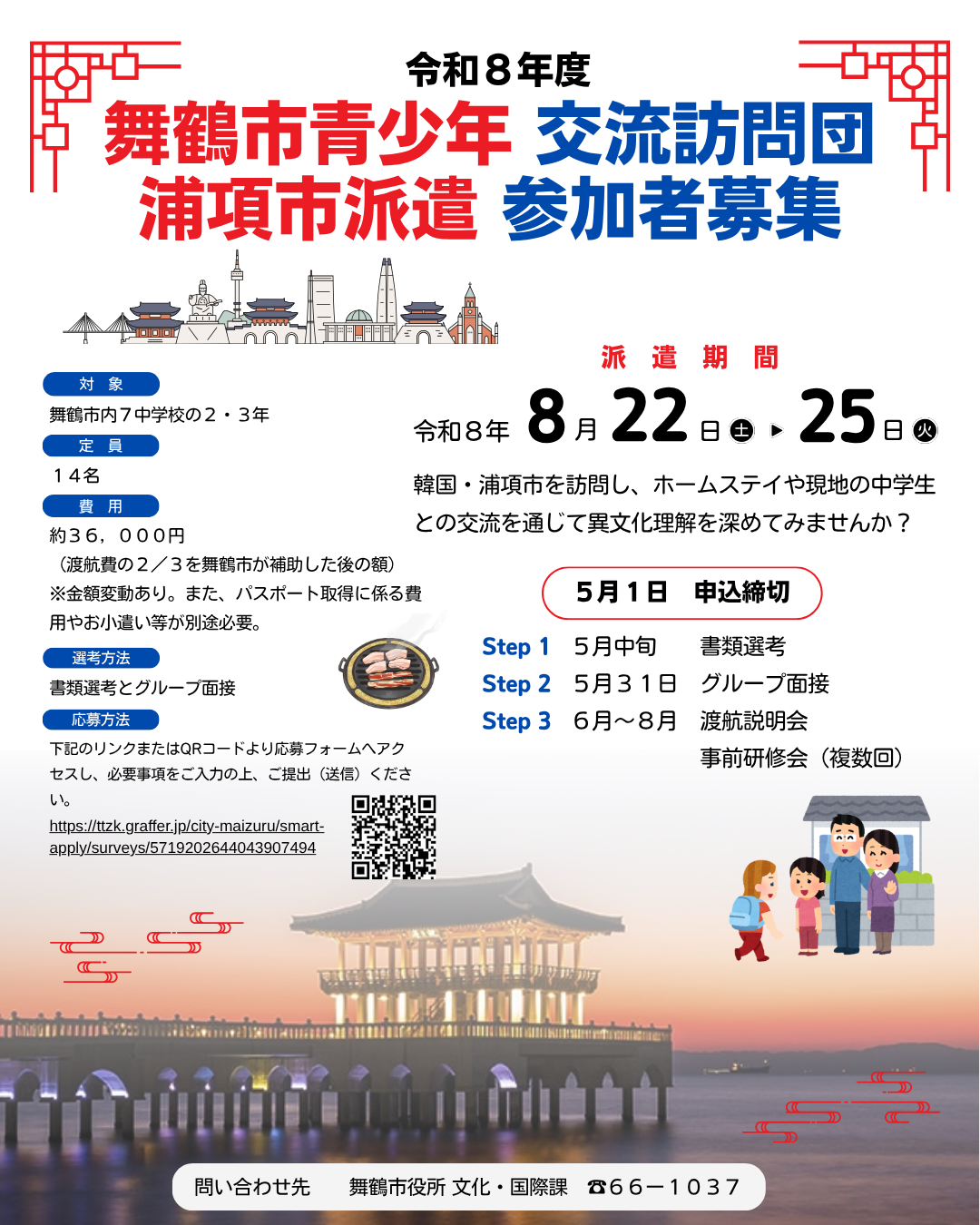 舞鶴市と浦項市とは、平成25年に初めて「浦項市青少年交流訪問団」を舞鶴市に受け入れて以来、両市間で相互理解の促進と国際人材の育成を目的に、中学生の相互訪問事業を継続しています。令和8年度については、舞鶴市から青少年交流訪問団を浦項市に派遣します。